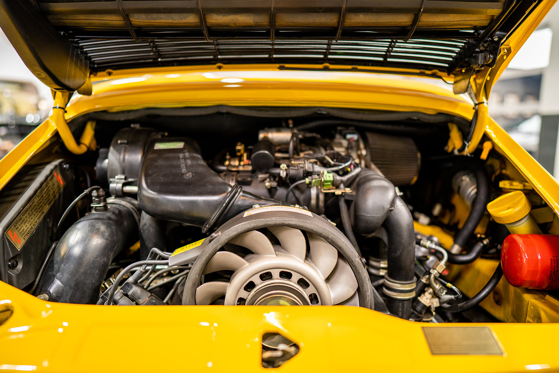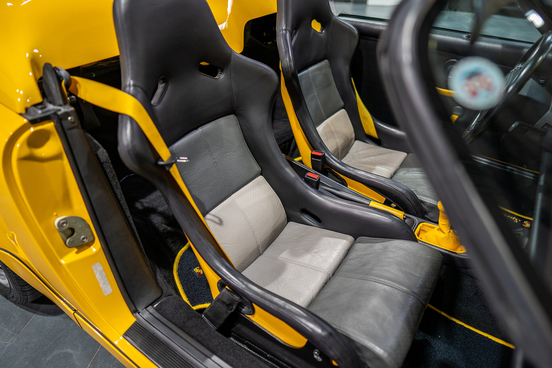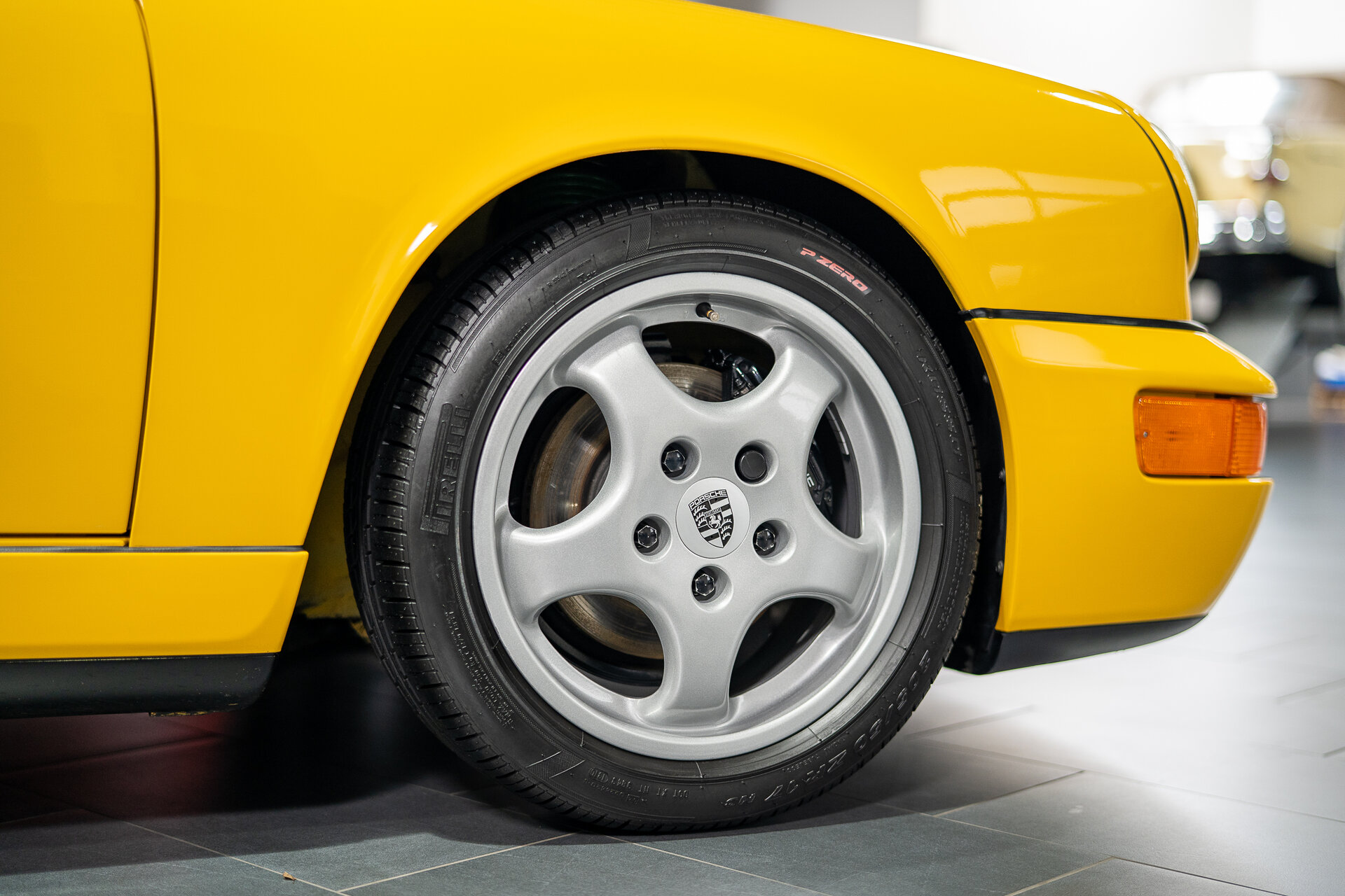 Um das Fahrverhalten weiter zu optimieren, wurde ein H&R Tiefelegungsfahrwerk verbaut. Dieses Fahrwerk sorgt nicht nur für eine verbesserte Straßenlage, sondern betont auch den sportlichen Charakter des Fahrzeugs. Zudem wurde ein hochwertiger Techart Auspuffschalldämpfer und Endrohr installiert, um dem Porsche 964 Speedster einen kraftvollen und unverwechselbaren Sound zu verleihen.