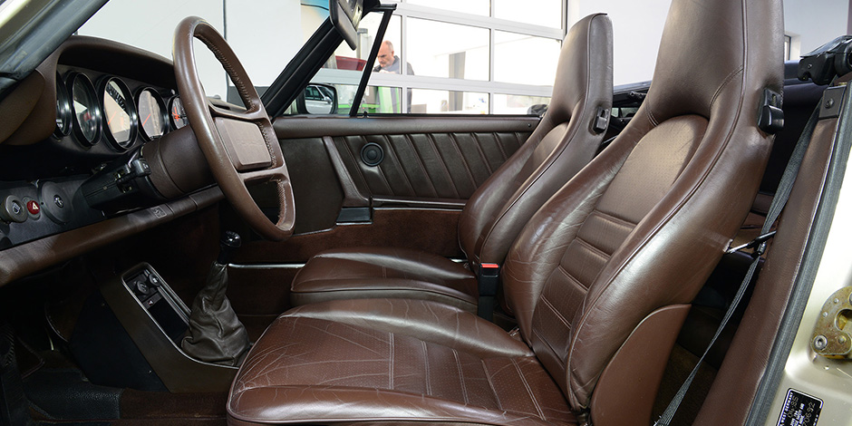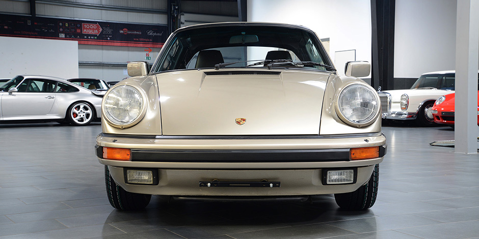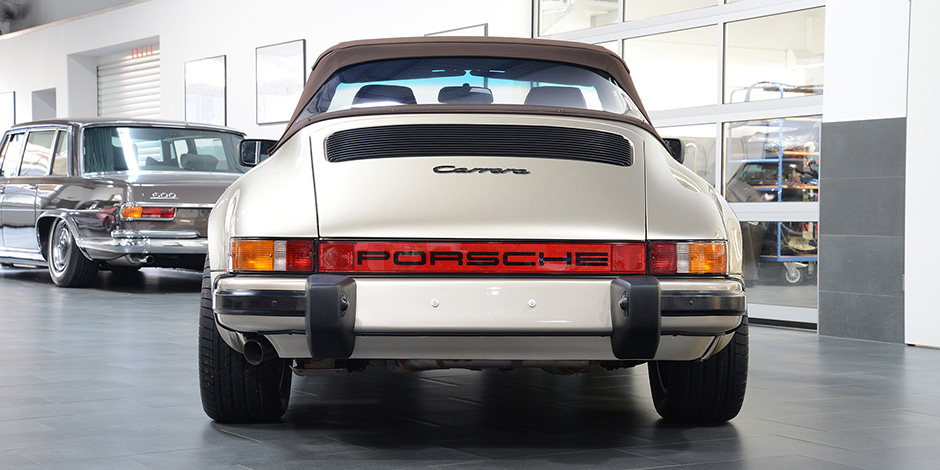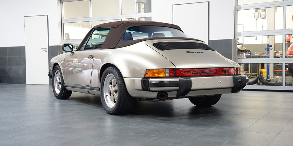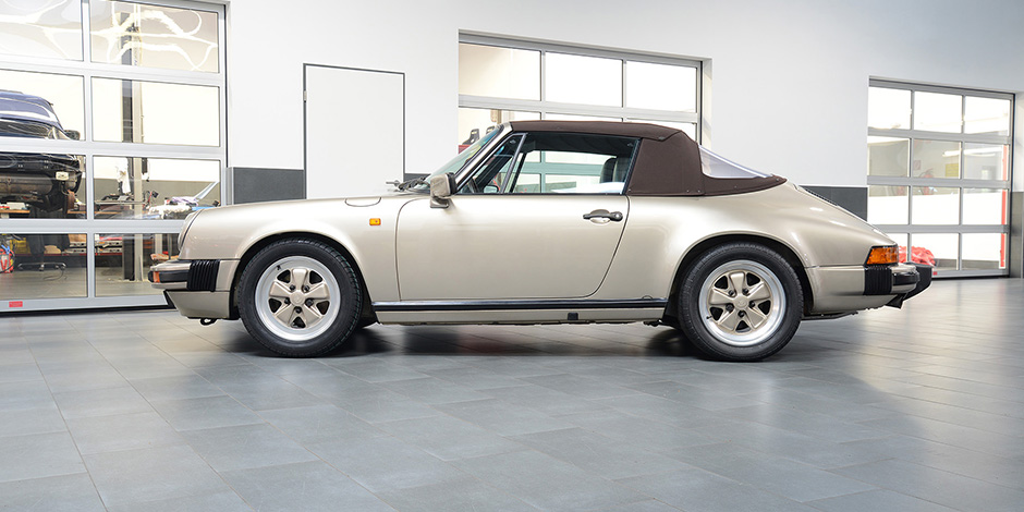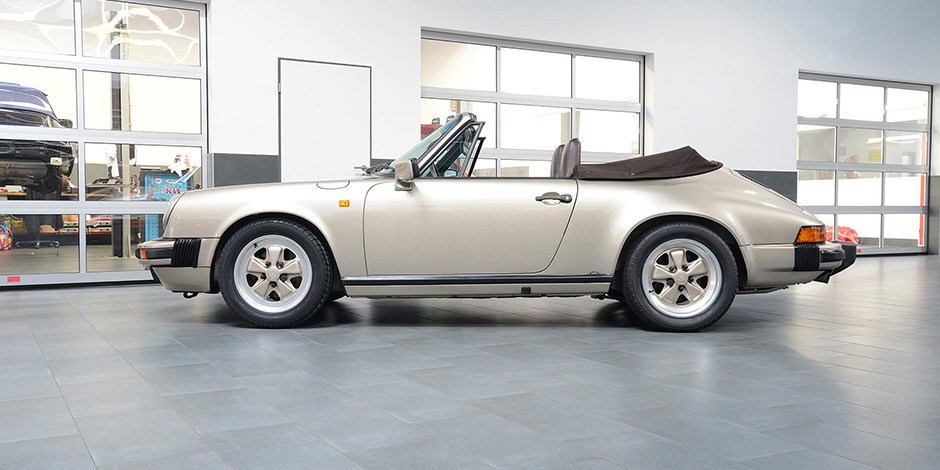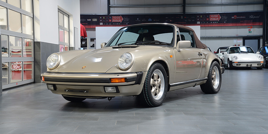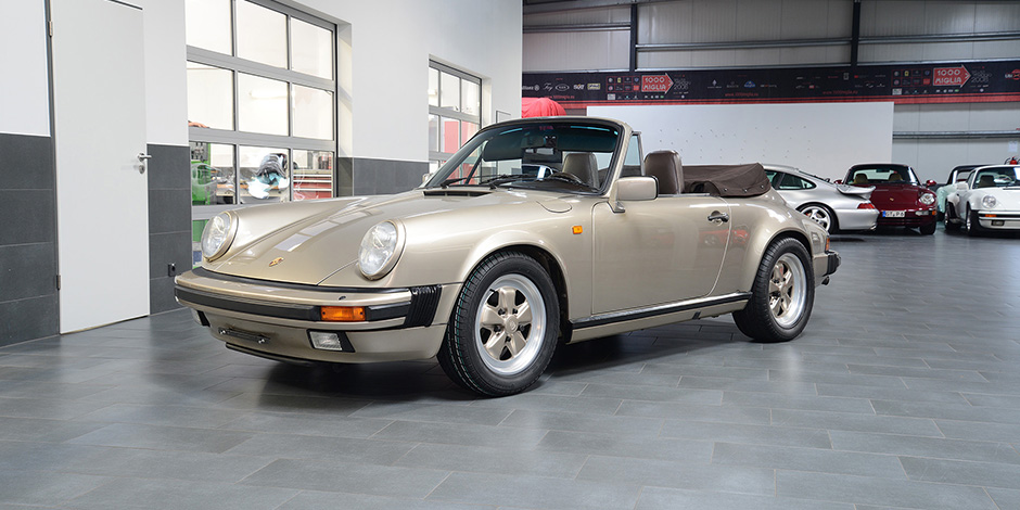 Porsche 911 3.2 Carrera Cabriolet in der Sonderfarbe weißgold Metallic.